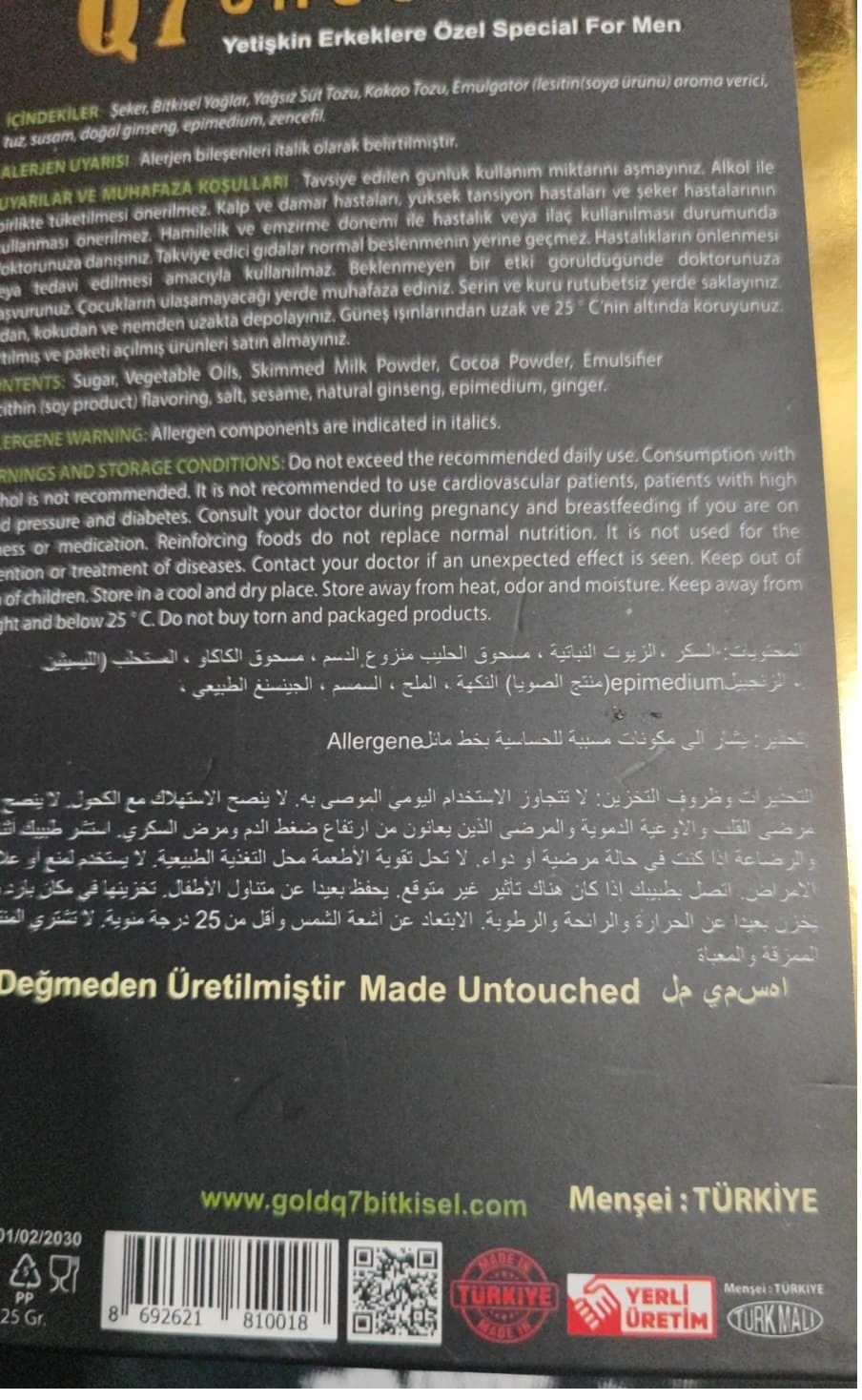 For optimal results, consume one sachet of Gold Q7 Chocolate daily. Simply tear open the sachet and enjoy directly, or mix with a warm beverage of your choice. Experience the natural power and enjoy the invigorating effects. Use one bar of 25 grams of Q7 chocolate (1 piece daily; 30 minutes to 1 hour before sex, and consume no more than one bar per day. Take it either 2 hours before or after meals.